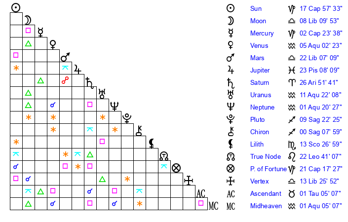 | Saturn | 26 Aries 39 | 15 Pisces 5 | 27 Aries 44 |
