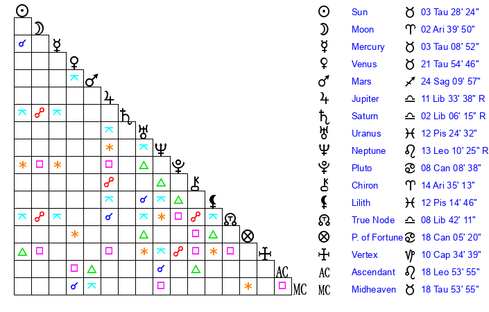 | Sun | 3 Taurus 29 | 4 Taurus 31 | 12 Leo 13 |