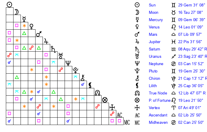 | Venus | 17 Capricorn 29 | 27 Aquarius 51 | 17 Gemini 38 |