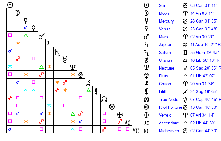 | Saturn | 25 Gemini 36 | 1 Aries 32 | 1 Cancer 43 |