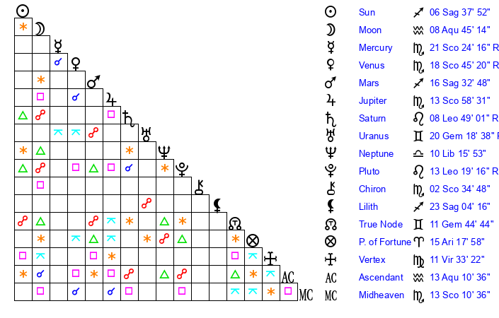 | Sun | 6 Sagittarius 38 | 7 Sagittarius 28 | 26 Aquarius 56 |