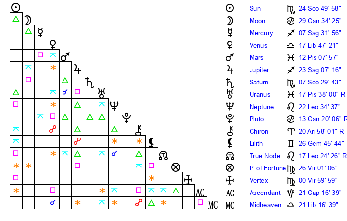 Moon | 29 Cancer 34 | 16 Gemini 59 | 7 Aries 15 |