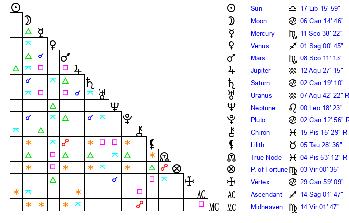 | Moon | 6 Cancer 12 | 17 Gemini 48 | 0 Leo 24 |
