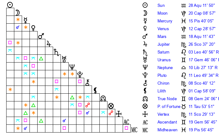 | Pluto | 11 Leo 48 | 2 Aquarius 34 | 11 Leo 0 |