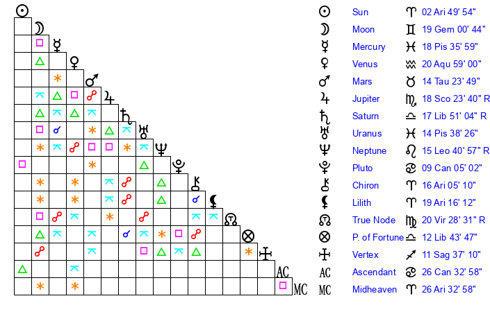 | Moon | 18 Gemini 54 | 27 Capricorn 58 | 24 Pisces 4 |