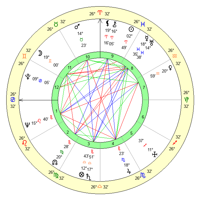 | Sun | 2 Aries 50 | 4 Aries 6 | 11 Cancer 28 |