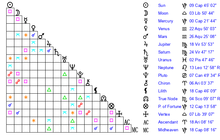 | Moon | 3 Libra 45 | 19 Capricorn 58 | 14 Cancer 49 |