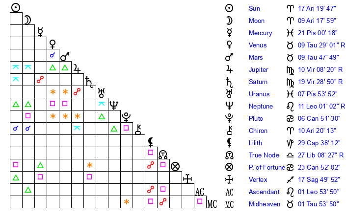 | Sun | 17 Aries 20 | 18 Aries 7 | 27 Cancer 24 |