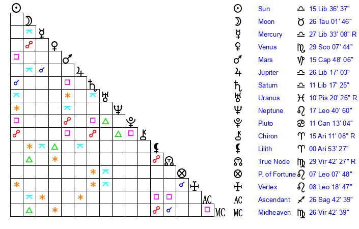 | Saturn | 11 Libra 53 | 27 Pisces 0 | 20 Libra 40 |