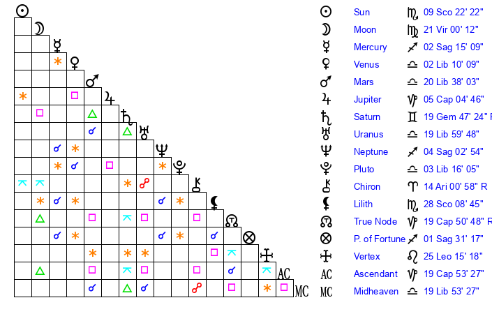| Mars | 20 Libra 38 | 27 Scorpio 58 | 25 Scorpio 57 |