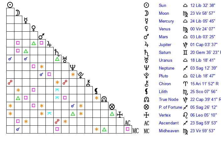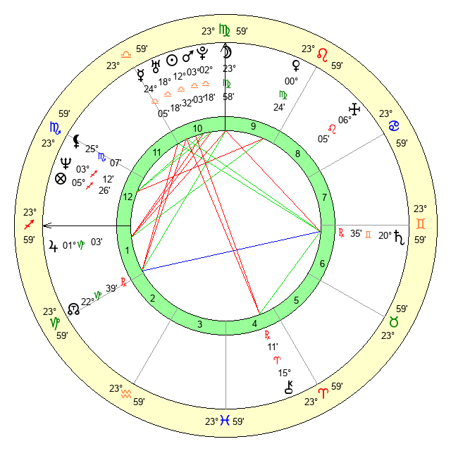 | Moon | 23 Virgo 51 | 22 Pisces 50 | 5 Virgo 8 |