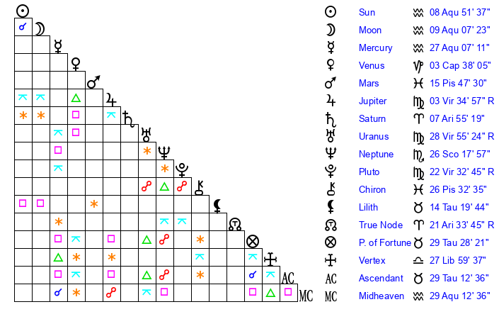 | Sun | 8 Aquarius 52 | 10 Aquarius 2 | 6 Aries 6 |