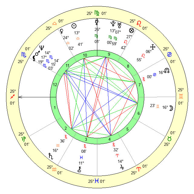 | Moon | 16 Gemini 10 | 22 Aries 13 | 25 Virgo 12 |