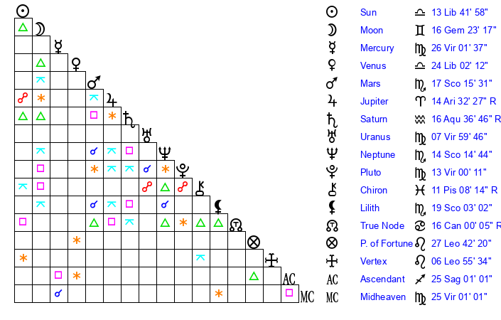 | Moon | 16 Gemini 10 | 22 Aries 13 | 25 Virgo 12 |