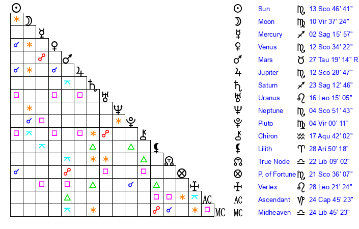 | Neptune | 4 Scorpio 51 | 29 Pisces 40 | 6 Scorpio 45 |