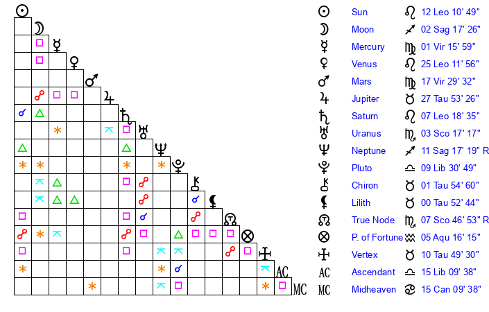 | Venus | 25 Leo 12 | 4 Cancer 59 | 25 Libra 26 |