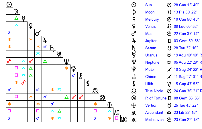 Sun | 28 Cancer 16 | 28 Cancer 14 | 22 Leo 12 |