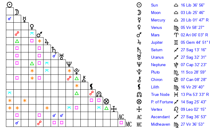 | Venus | 5 Virgo 58 | 24 Virgo 49 | 20 Libra 21 |