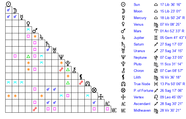 | Moon | 15 Libra 29 | 7 Gemini 2 | 22 Aquarius 5 |