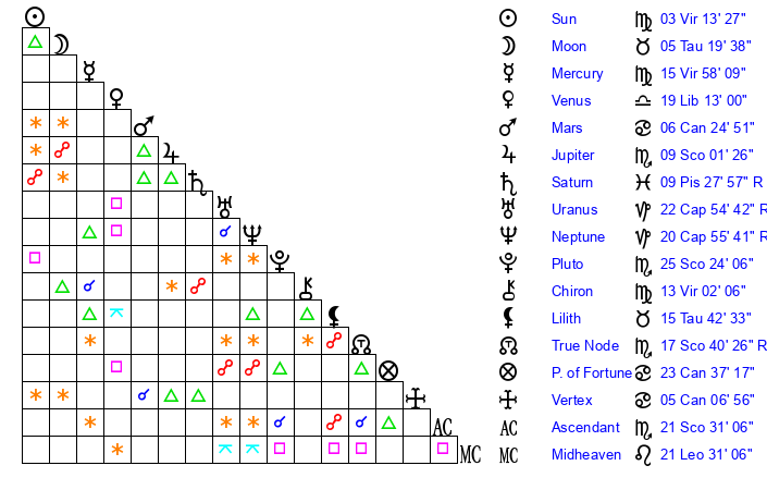 | Moon | 5 Taurus 21 | 13 Libra 44 | 18 Gemini 49 |