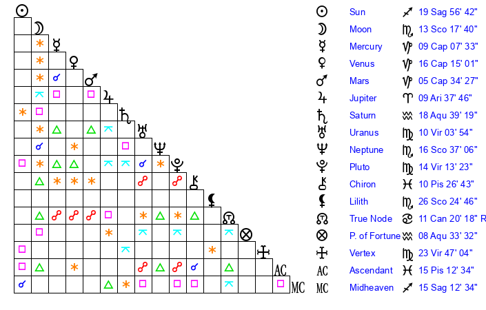 | Moon | 13 Scorpio 17 | 0 Libra 27 | 13 Aquarius 0 |