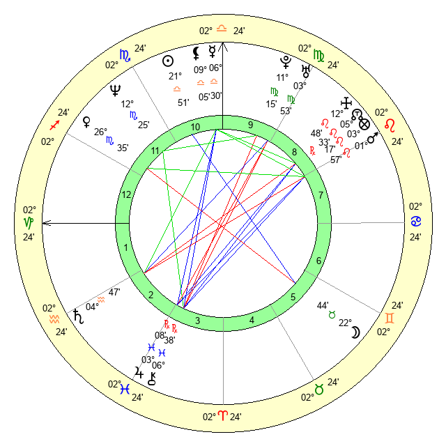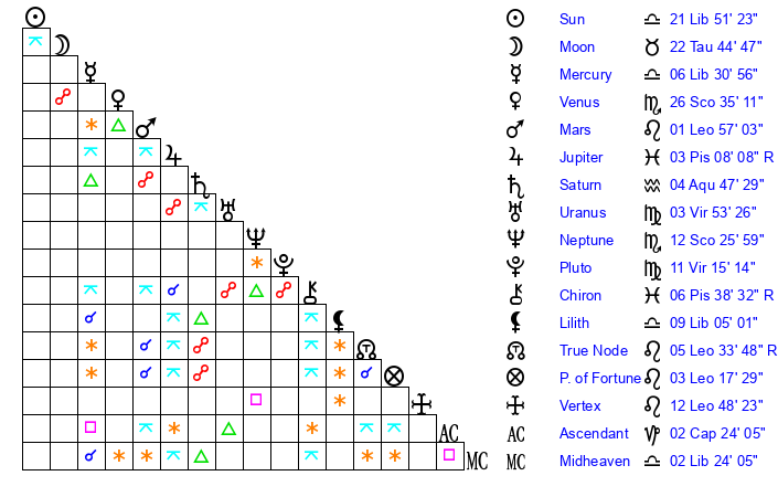| Sun | 21 Libra 51 | 22 Libra 35 | 25 Sagittarius 17 |