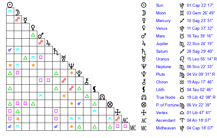 | Saturn | 28 Sagittarius 50 | 25 Pisces 39 | 5 Capricorn 39 |