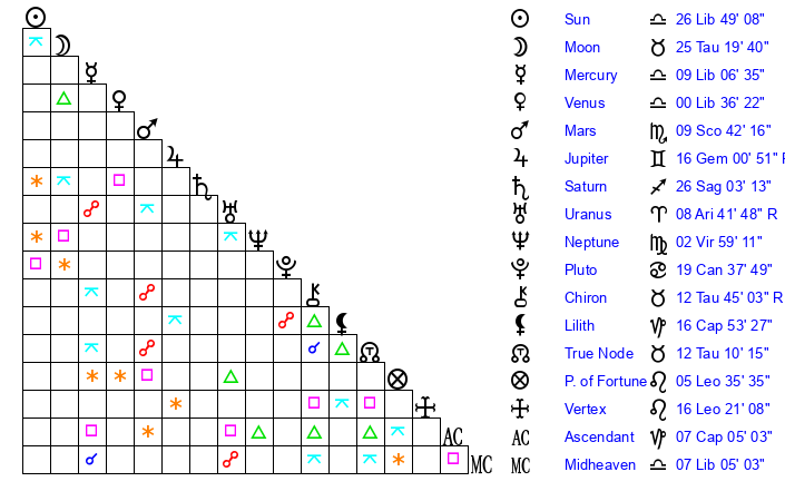 | Sun | 26 Libra 49 | 27 Libra 33 | 4 Aquarius 0 |