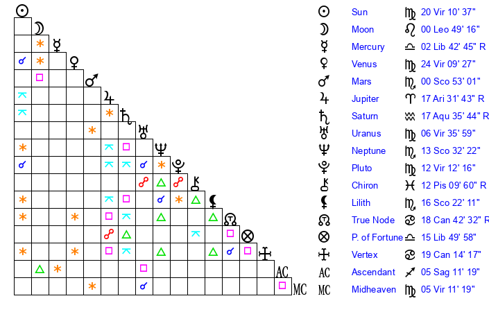 | Sun | 20 Virgo 11 | 21 Virgo 9 | 21 Scorpio 36 |
