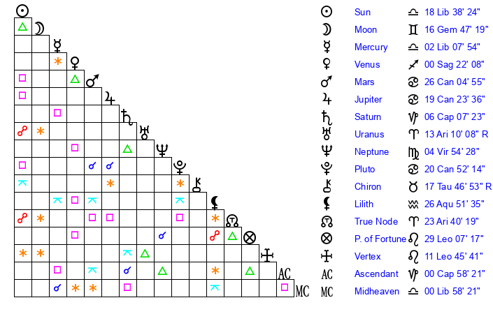 Sun | 18 Libra 38 | 19 Libra 37 | 24 Capricorn 36 |