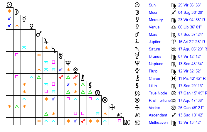| Neptune | 13 Scorpio 48 | 0 Aries 44 | 15 Scorpio 59 |