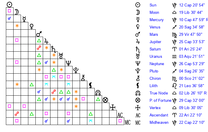 | Moon | 19 Libra 25 | 17 Aquarius 5 | 27 Libra 55 |