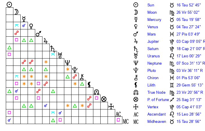 Uranus | 17 Leo 2 | 26 Taurus 42 | 19 Leo 25 |