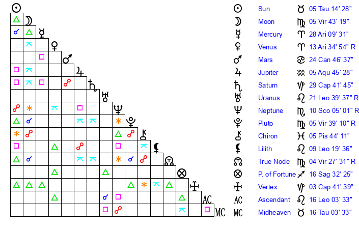 | Moon | 5 Virgo 38 | 6 Aries 0 | 9 Capricorn 11 |