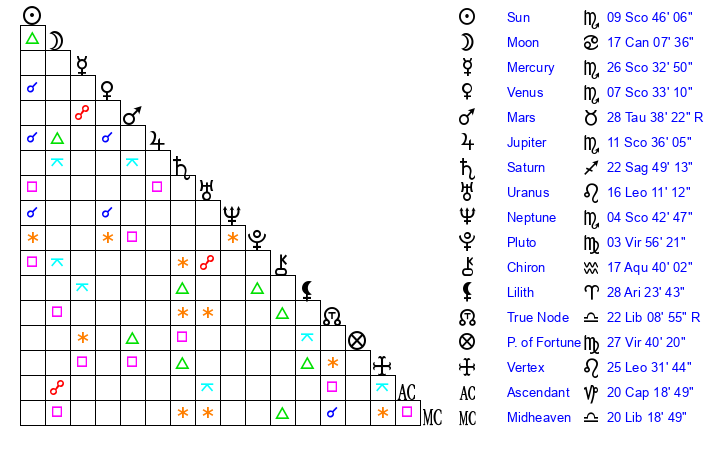 | Sun | 9 Scorpio 46 | 10 Scorpio 31 | 17 Capricorn 40 |