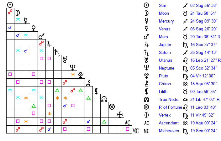 | Mars | 20 Taurus 38 | 15 Sagittarius 23 | 25 Taurus 58 |