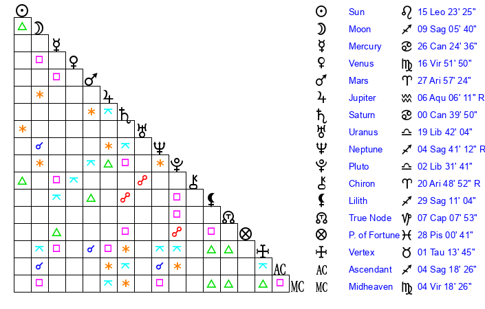 Venus | 16 Virgo 52 | 9 Cancer 12 | 18 Scorpio 16 |