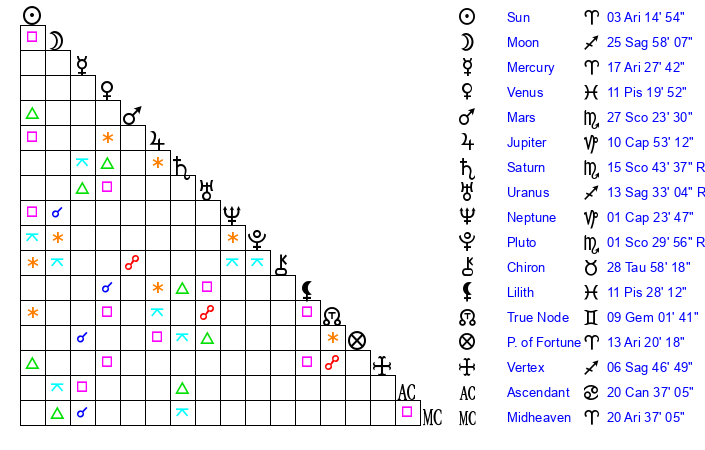 | Sun | 3 Aries 15 | 3 Aries 19 | 13 Taurus 26 |