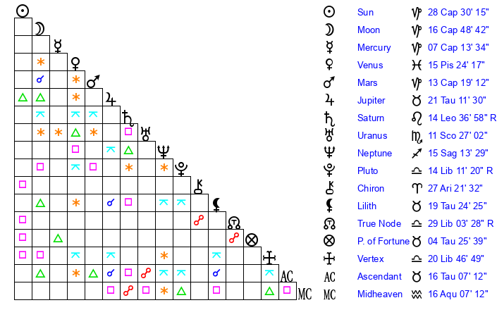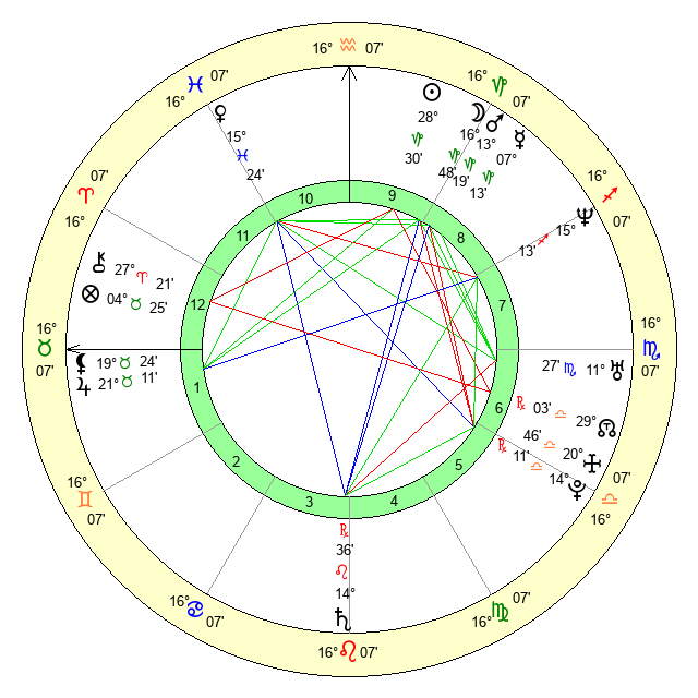 | Moon | 16 Capricorn 54 | 24 Virgo 40 | 13 Libra 19 |