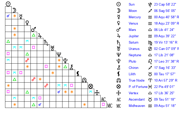 | Neptune | 17 Libra 21 | 27 Pisces 32 | 16 Libra 10 |