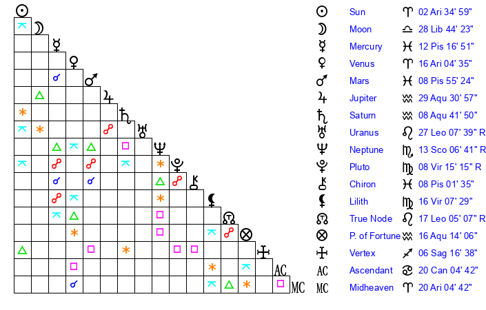 | Venus | 16 Aries 5 | 2 Aries 15 | 3 Cancer 8 |