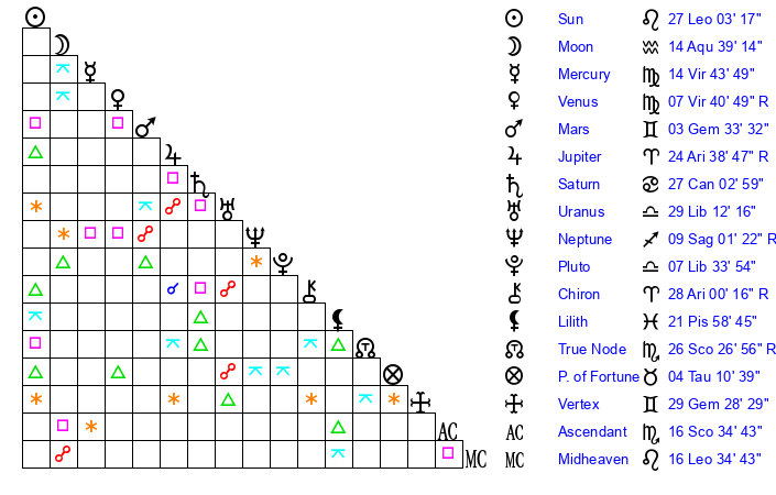 | Moon | 14 Aquarius 34 | 26 Cancer 17 | 17 Sagittarius 31 |