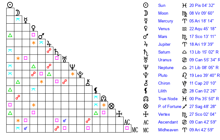 | Neptune | 21 Libra 7 | 29 Pisces 15 | 19 Libra 18 |