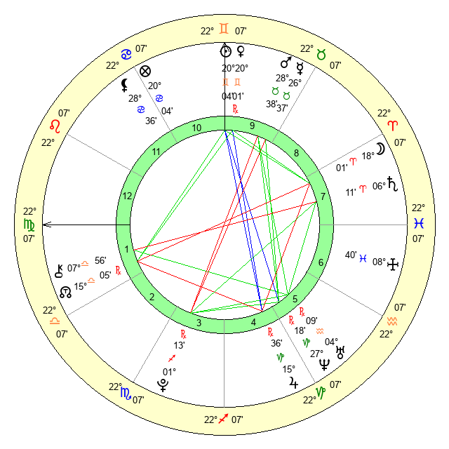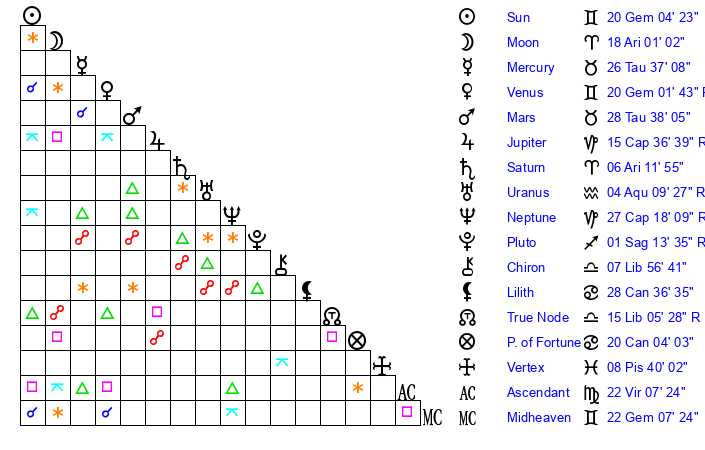 | Moon | 17 Aries 57 | 13 Sagittarius 11 | 10 Taurus 46 |