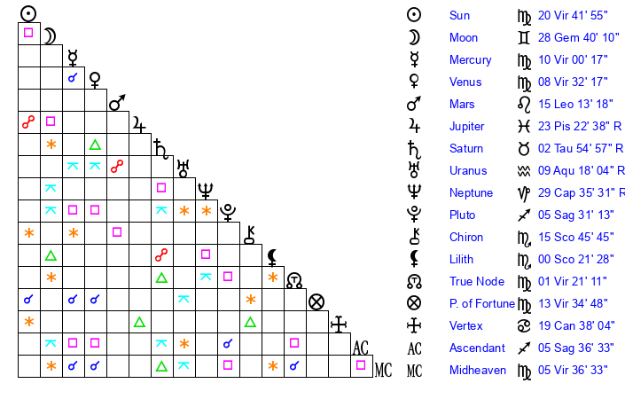 | Mercury | 10 Virgo 1 | 21 Virgo 23 | 27 Libra 47 |