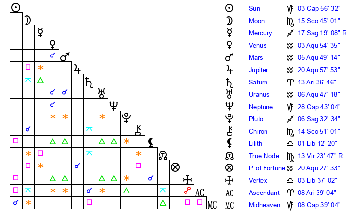| Mars | 5 Aquarius 49 | 3 Leo 46 | 27 Aquarius 6 |