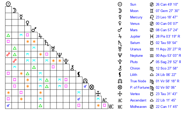 | Venus | 0 Cancer 5 | 16 Gemini 52 | 2 Leo 50 |