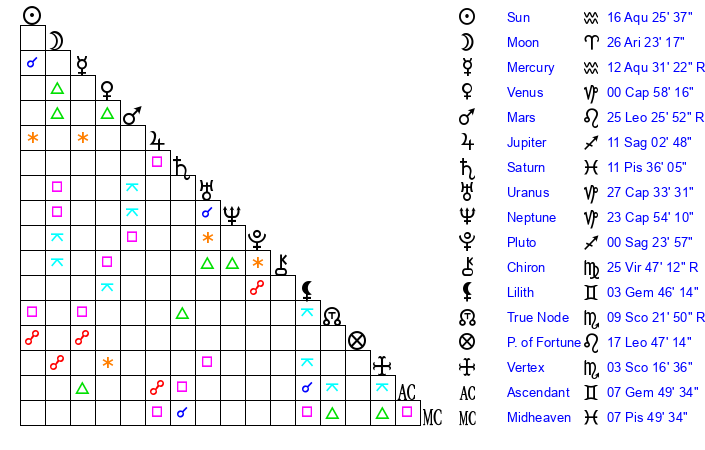 | Sun | 16 Aquarius 25 | 17 Aquarius 9 | 16 Pisces 39 |