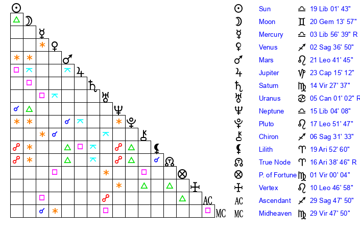 | Neptune | 15 Libra 4 | 0 Aries 13 | 17 Libra 13 |