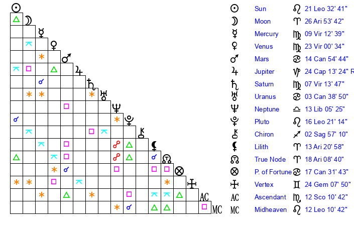 | Moon | 26 Aries 51 | 2 Taurus 2 | 17 Aquarius 39 |